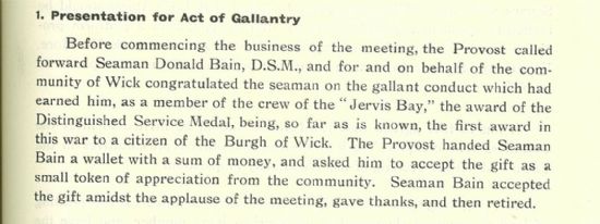 Finally this week, on 6 June Wick Burgh Council honoured Seaman Donald Bain, survivor of HMS Jervis Bay which had been sunk defending a convoy of merchant ships in November 1940. Seaman Bain had been awarded the Distinguished Service Medal, “being, so far as is known, the first award in this war to a citizen of the Burgh of Wick. The Provost handed Seaman Bain a wallet with a sum of money, and asked him to accept the gift as a small token of appreciation from the community.”