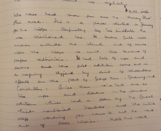 she wrote about The Orkney Blast, the forces’ newspaper started by the writer Eric Linklater which ran from January 1941 to November 1944. Its editor was Gerry (“Geremy”) Meyer. “We have had some fun over the “Orkney Blast” this week. This is a paper started in January for the troops. Originally by Eric Linklater when he was stationed here… It’s had lots of ups and downs and the first edition came out in a raging blizzard by dint of stupendous efforts on the part of George Tuck, Geremy and [Lieutenant] Crichton.”