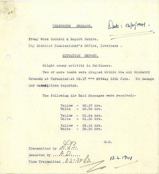 A dummy airfield had been constructed at Thrumster, just south of Wick, to lure German air attacks away from Wick airfield, especially at night. The ruse was obviously successful, for the Wick Control and Report Centre recorded, “Slight enemy activity in Caithness. Two or more bombs were dropped within the Air Ministry Grounds at 02.15 hrs Friday 13th June. No damage or casualties reported.”