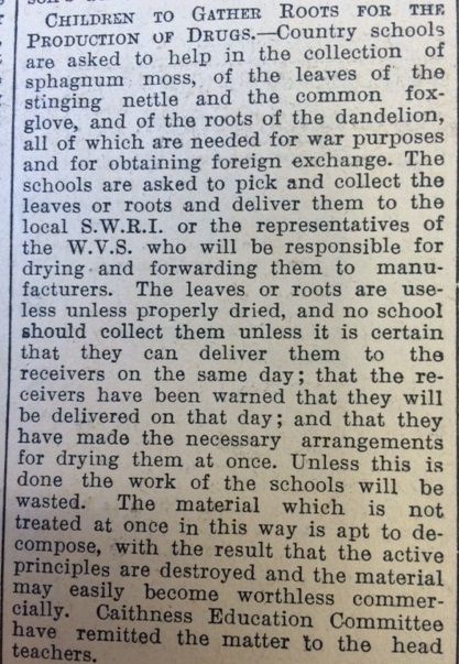 Finally this week, the John O’Groat Journal reported that schools across the county were being asked to gather roots for the production of drugs, specifically “the collection of sphagnum moss, of the leaves of the stinging nettle and the common foxglove, and of the roots of the dandelion, all of which are needed for war purposes.” Schools should only collect them if they could deliver them to the authorities immediately, as the plant materials rapidly decayed. Asking children to pick stinging nettles may seem rather hazardous; but then, of course, there was a war on.