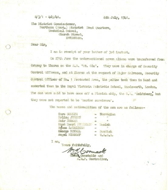 Another group of foreign nationals were landed at Thurso this week, from Orkney on board the SS Ola. Interestingly, because the men were Norwegian, Danish, Swedish and Russian (i.e., from nations currently hostile to Britain) they were escorted by “Security Control Officers” and police all the way to London: “The men were said to have come off a Finnish ship, the S.S. Rolfsberg, but they are not reported to be “marine survivors”.”