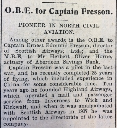 Finally this week, the paper reported that Captain Ernest Fresson had received an OBE. “Captain Fresson was a pilot in the last war, and he recently completed 25 years of flying… Ten years ago he founded Highland Airways, which operated a mail and passenger service from Inverness to Wick and Kirkwall.” Captain Fresson made the inaugural flight himself, landing in Wick on 29 May 1933. Earlier in the same month he flew the first scheduled passenger service on the same route and in November of 1934 he operated the first UK air ambulance flight.