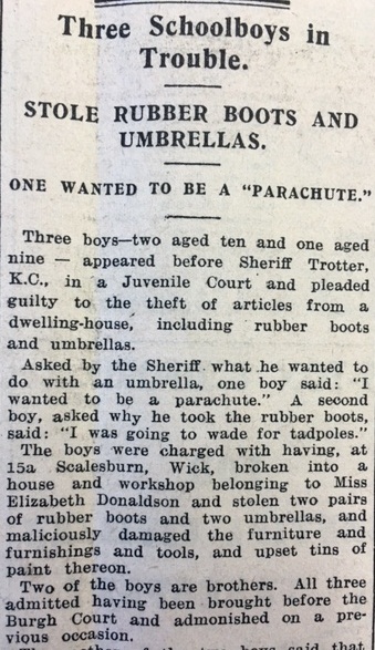 Also in the John O’Groat Journal this week, three young boys (aged 9 and 10) appeared in Juvenile Court this week accused of stealing articles, including rubber boots and umbrellas, from a dwelling house. The mother of two of the boys had found the stolen goods, “thrashed them for their bad behaviour”, and insisted they return them, but the police had arrived before this could happen. “Asked by the Sheriff what he wanted to do with an umbrella, one boy said, “I wanted to be a parachute.” A second boy, asked why he took the rubber boots, said: “I was going to wade for tadpoles.”” The boys were put on probation for two years.