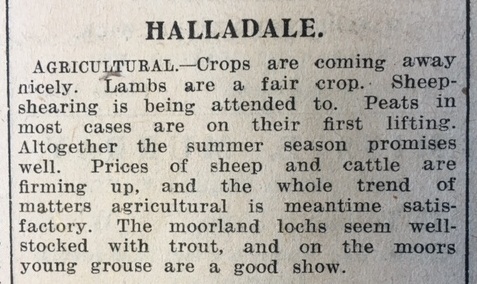 The district report in the John O’Groat Journal for Halldale gives a good impression of the activity in farms across the county: “Crops are coming away nicely. Lambs are a fair crop. Sheep-shearing is being attended to. Peats in most cases are on their first lifting… The moorland lochs seem well-stocked with trout, and on the moors young grouse are a good show.”
