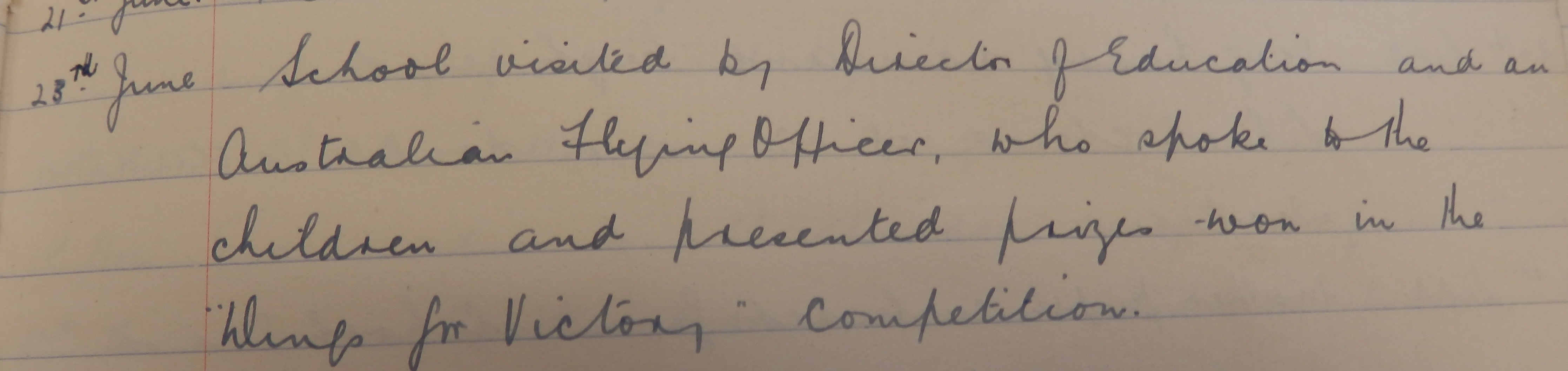 The pupils of John O’Groats School had an exciting visitor on 23 June, as the Head Teacher recorded in the log book: “School visited by Director of Education and an Australian Flying Officer, who spoke to the children and presented prizes won in the “Wings for Victory” competition.”