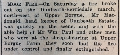 Caithness had been enjoying summer weather, and now the John O’Groat Journal reported that a fire had broken out “on the Dunbeath-Berriedale march, north-west of Upper Borgue. Mr Macdonald, head keeper of Dunbeath Estate, was quickly on the scene and with the help of … other men who were at the sheep-shearing at Upper Borgue Farm they soon had the fire under control.”