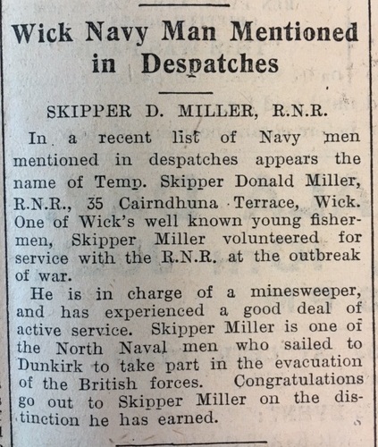 Finally this week, the John O’Groat Journal reported that Skipper Donald Miller of Wick had been mentioned in despatches. “One of Wick’s well-known young fishermen, Skipper Miller volunteered for service with the R.N.R. at the outbreak of war. He is in charge of a minesweeper, and has experienced a good deal of active service. Skipper Miller is one of the North Naval men who sailed to Dunkirk to take part in the evacuation of the British forces.”
