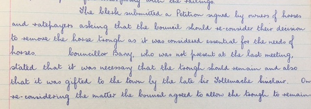 10 Aug Thurso Burgh Mins Horse troughThurso Town Council finally laid to rest the vexed question of the town horse trough being removed for salvage, after they received a petition “signed by owners of horses and rate payers … as [the horse trough] was considered essential for the needs of horses”. Councillor Barry also pointed out “that it was gifted to the town by the late Sir Tollemache Sinclair. On reconsidering the matter the Council agreed to allow the trough to remain.”