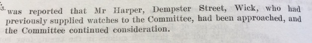 11 Aug Ed CC Mins watches as prizes 1The County Education Committee noted a new problem caused by wartime shortages. Watches had hitherto been given as prizes for pupils with a perfect attendance record; now, however, “Mr Macadie, Jeweller, Wick, was finding very great difficulty in obtaining watches and had not been able to give a delivery of11 Aug Ed CC Mins watches as prizes 2 watches ordered a year ago. Mr Macadie had also indicated that the cost of watches would now be in the vicinity of £5 10s each.”