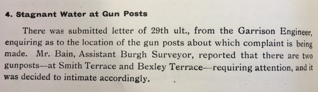 In Wick, complaints had been made about the nuisance of stagnant water in gun posts in the town. Wick Burgh Council had received a letter from the Garrison Engineer this week, wishing to know which posts were being complained about: “Mr Bain, Assistant Burgh Surveyor, reported that there are two gun posts – at Smith Terrace and Bexley Terrace –requiring attention, and it was decided to intimate accordingly.”