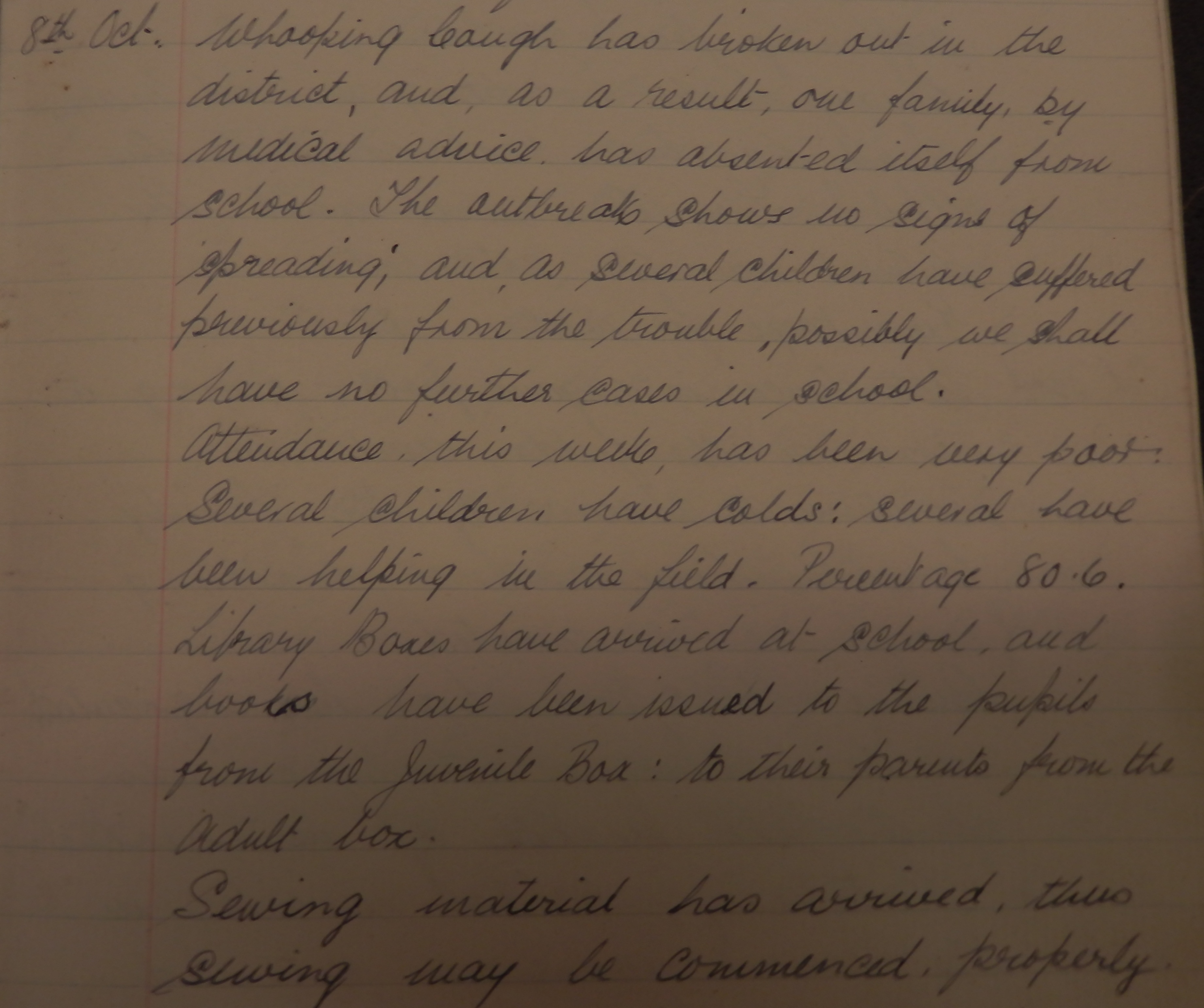 The teachers of Canisbay School had more things to worry about than the harvest, however. On 8 October the head teacher wrote in the log book, “Whooping cough has broken out in the district, and as a result one family by medical advice has absented itself from school… Attendance this week has been very poor. Several children have colds; several have been helping in the field. Percentage 80.6”