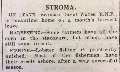 On Stroma, as the John O’Groat Journal reported, the harvest was almost all in, and “lobster fishing is practically finished. Most of the fishermen have their creels ashore.” It is interesting to note that it wasn’t only school pupils who got time off at this time of year: “Seaman David Wares, R.N.R., is meantime home on a month’s harvest leave.”