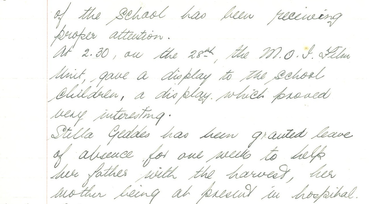 29 Oct Canisbay Harvest  Film Show p1The Head Teacher of Canisbay School noted with satisfaction in the log book this week that “There has been a 29 Oct Canisbay Harvest  Film Show p2welcome rise in percentage [of pupils attending] this week, since the harvest has been well advanced and the potato lifting finished… Stella Geddes has bene granted leave of absence for one week to help her father with the harvest, her mother being at present in hospital.” The school also had a visit from the Ministry of Information Film Unit, who “gave a display to the school children, a display which proved very interesting.”
