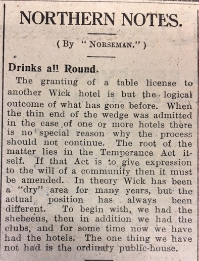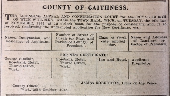 29 Oct JOG Norseman on licensingFinally this week, ‘Norseman’ in the John O’Groat Journal noted that prohibition in Wick, which had been in force since 1922, was gradually29 Oct JOG Rosebank Notice being eroded, as the Rosebank Hotel on Thurso Street was granted a licence to serve alcohol to dining customers: “In theory Wick has been a “dry” area for many years, but the actual position has always been different. To begin with, we had the shebeens, then in addition we had the clubs, and for some time now we have had the hotels. The one thing we have not had is the ordinary public house.”
