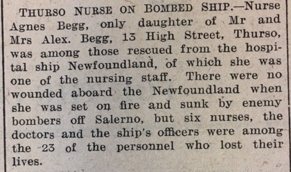 29 Oct JOG Nurse on bombed shipThe John O’Groat Journal reported that a nurse from Thurso, Agnes Begg, was among those rescued from the hospital ship Newfoundland: “There were no wounded aboard the Newfoundland when she was set on fire and sunk by enemy bombers off Salerno, but six nurses, the doctors and the ship’s officers were among the 23 of the personnel who lost their lives.”