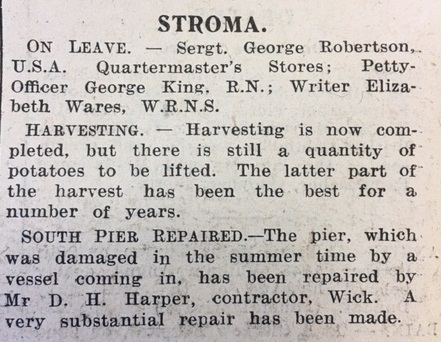 5 Nov JOG Stroma NewsBack in Caithness the harvest was effectively over, and potato lifting was in full swing. As the John O’Groat Journal reported, on Stroma “Harvesting is now completed, but there is still a quantity of potatoes to be lifted. The latter part of the harvest has been the best for a number of years.”