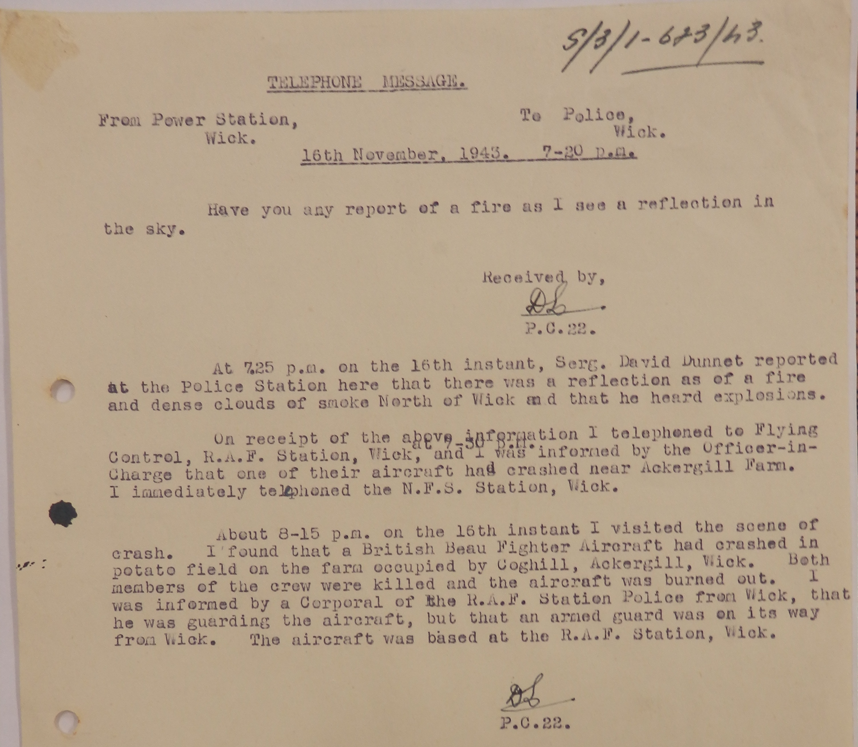 On the night of 17 November the police constable at the Power Station at Wick telephoned the police station to ask, “Have you any report of a fire as I see a reflection in the sky”. Flying Control at the R.A.F. Station confirmed “that one of their aircraft had crashed near Ackergill Farm”. It turned out that “a British Beau Fighter Aircraft had crashed in potato field on the farm occupied by Coghill, Ackergill, Wick. Both members of the crew were killed and the aircraft was burned out.”