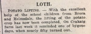 In the north Highlands the lifting of the potato crop was well underway. The John O’Groat Journal reported that in Loth, “With the excellent help of the school children from Brora and Helmsdale the lifting of the potato crop has now been completed. On Crakaig farm last week it reminded one of bygone days, when nearly fifty turned out.”