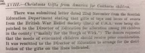 At a meeting of the Education Committee on 8 December it was noted that “gifts of toys and boxes of sweets from the British War Relief Society of the USA were being dispatched to the Director of Education for allocation among 100 children in the county (‘mainly for the Burgh of Wick’). The donors requested that the needs of evacuated children should receive prior consideration.”