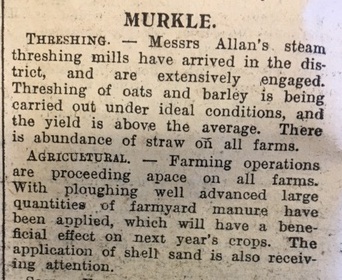At Murkle in Caithness “Messrs Allan’s steam threshing mills have arrived in the district and are extensively engaged. Threshing of oats and barley is being carried out under ideal conditions, and the yield is above the average. There is abundance of straw on all farms.”