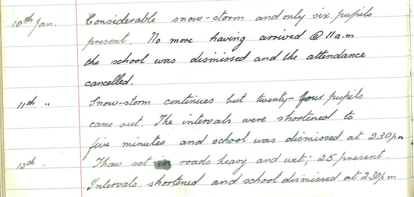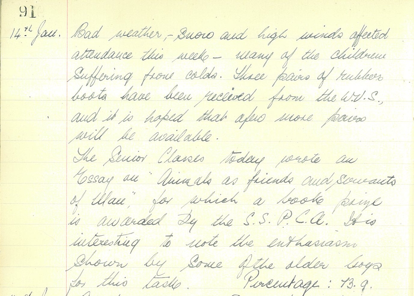 There was rough weather in Canisbay too. The head teacher recorded in the log book on 14 January: “Bad weather – snow and high winds affected attendance this week – many of the children suffering from colds. Three pairs of rubber boots have been received from the W.V.S., and it is hoped that a few more pairs will be available.”
