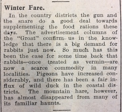 supplementing the food rations these days… [and] rabbits – once treated as vermin – are now a scarce commodity in many localities. Pigeons have increased considerably, and there has been a fair influx of wild duck in the coastal districts.”