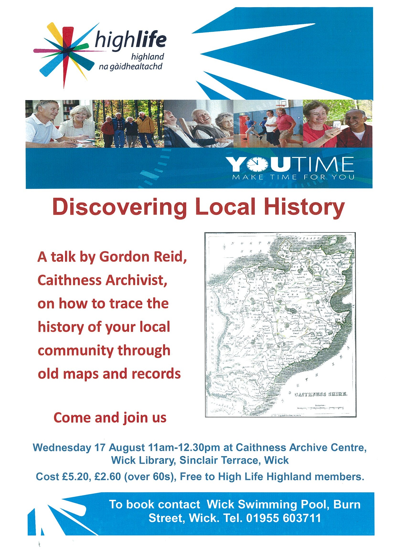 We’ll be delivering a one-off class in Discovering Local History here in the Archive Centre as part of the You Time Programme on Wednesday 17st August, between 11.00am and 12.30pm. If you’d like to know how to use old maps and records to trace the history of your house or local community, or just want to learn more about how your Caithness ancestors lived, why not come along and join us – who knows what you might discover?