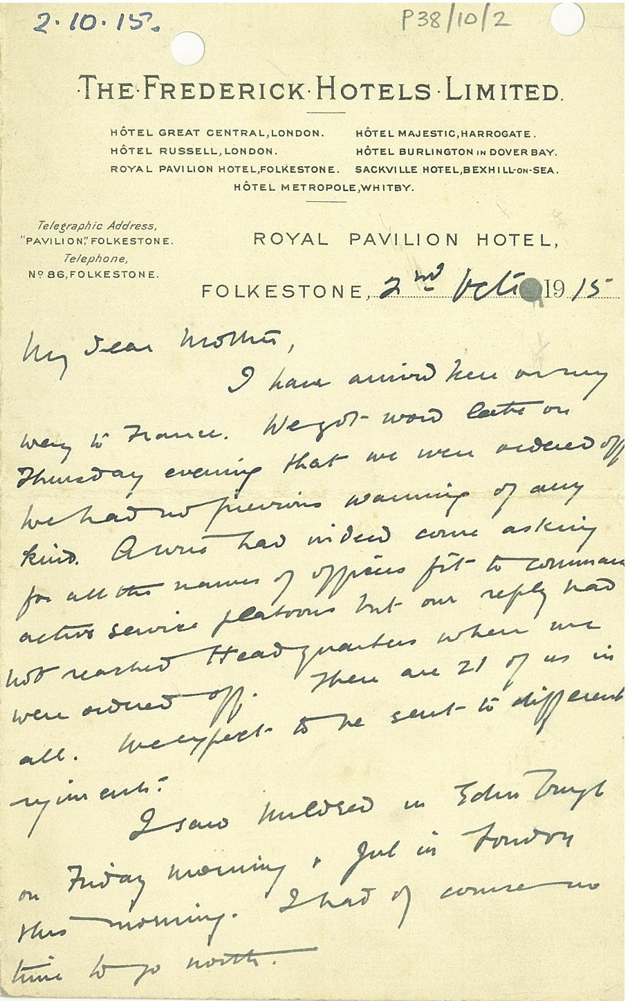 2 October 1915, Royal Pavilion Hotel, Folkestone