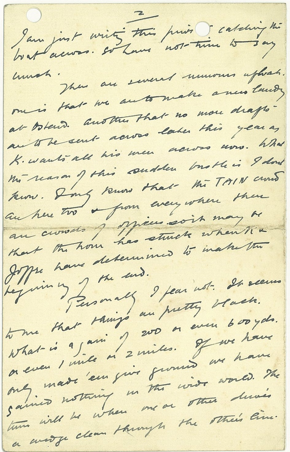 Personally I fear not. It seems to me that things are pretty black. What is a gain of 200 or even 600 yards, or even 1 mile or 2 miles. If we have only made ’em give ground we have gained nothing in the wide world. The time will be when one or other drives a wedge clean through the other’s line. Then the war will be decided.