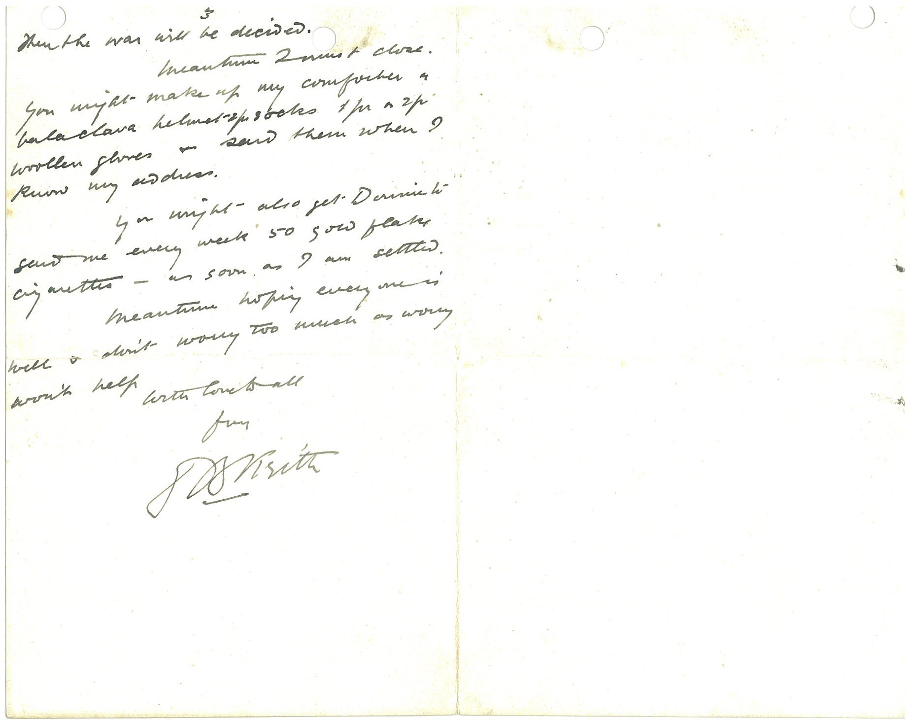 Meantime I must close. You might make up my comforter & balaclava helmet – 2 [pairs] socks 1 [pair] or 2 [pairs] woollen gloves & send them when I know my address.