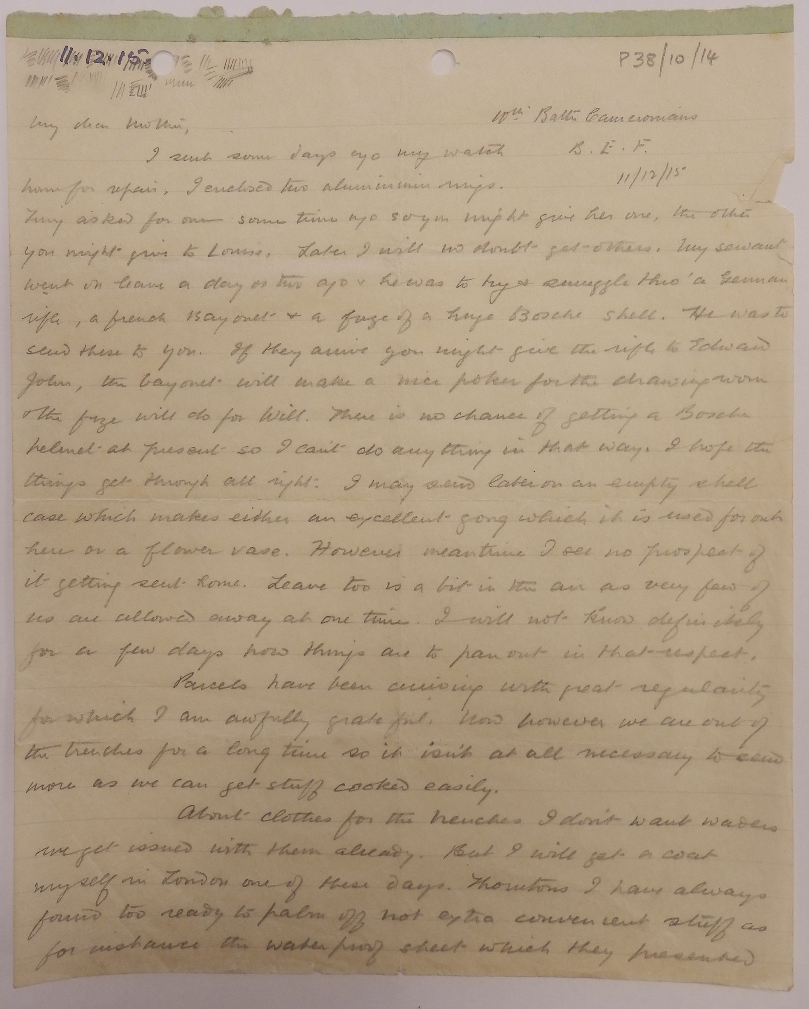 Dated 11th December 1915, 10th Battalion Cameronians, B.E.F.