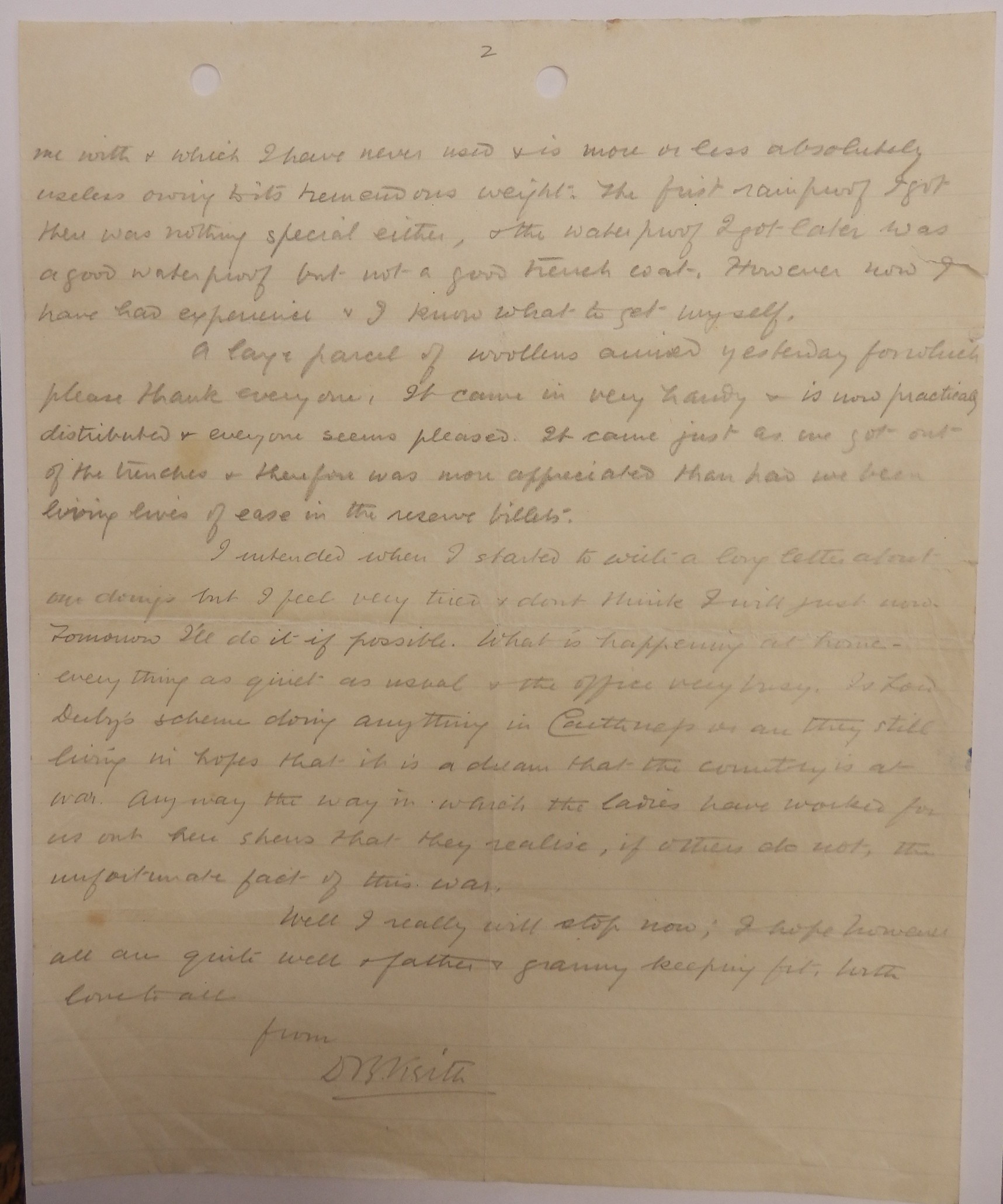 I intended when I started to write a long letter about our doings but I feel very tired & don’t think I will just now. Tomorrow I’ll do it if possible. What is happening at home – everything as quiet as usual & the office very busy. Is Lord Derby’s scheme doing anything in Caithness or are they still living in hopes that it is a dream that the country is at war. Anyway the way in which the ladies have worked for us out here shews that they realise, if others do not, the unfortunate fact of this war. Well I really will stop now; I hope however all are quite well & father & granny keeping fit. With love to all