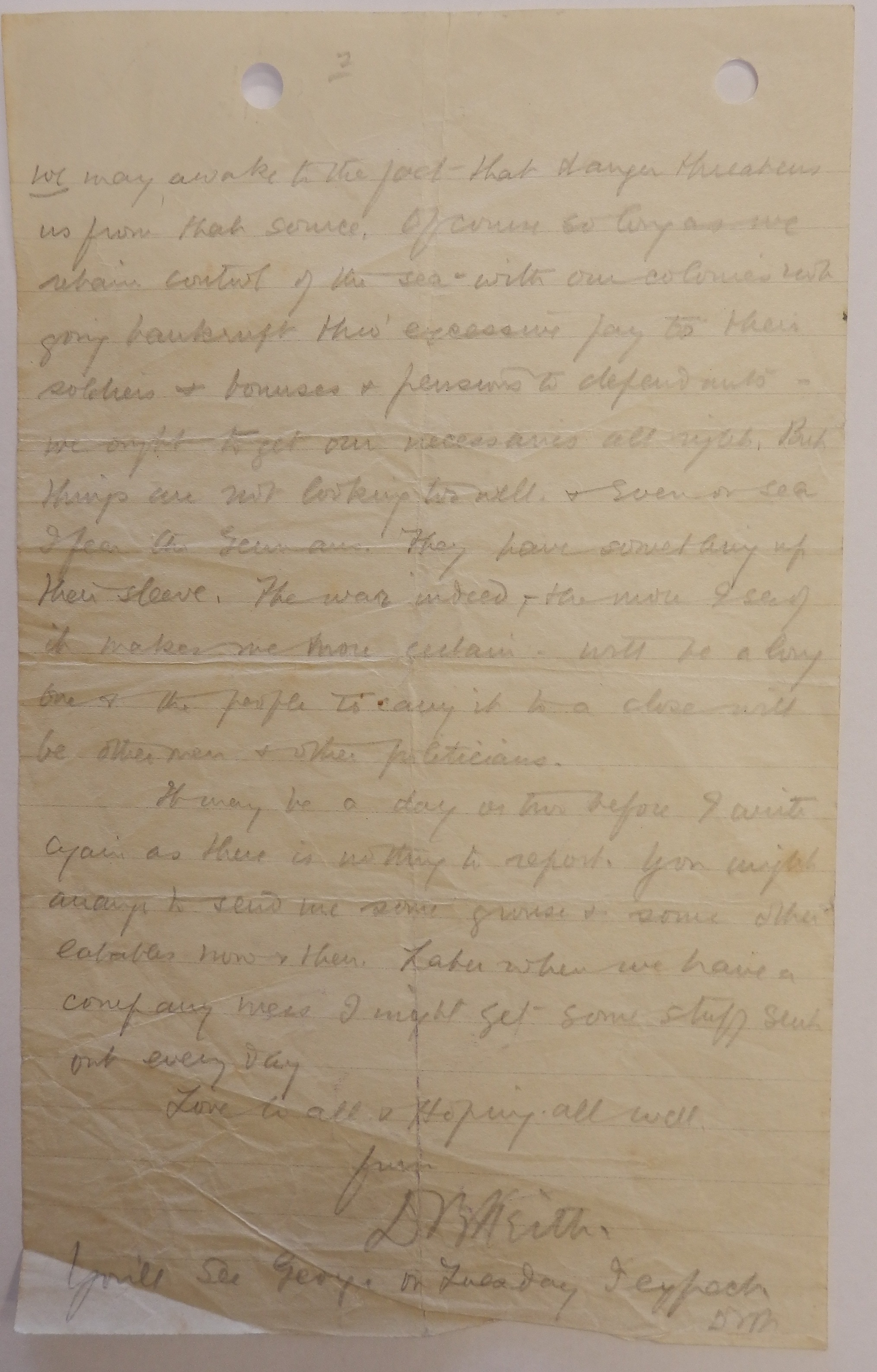 So public opinion seems to be rather against our success. The war anyway is hardly started. I do not believe the economic factor will defeat Germany. Germany is far too systematic to fail to take all due precaution against that. Some day a year or so hence we may awake to the fact that danger threatens us from that source. Of course so long as we retain control of the sea – with our colonies not going bankrupt thro’ excessive pay to their soldiers & bonuses & pensions to dependents – we ought to get our necessaries all right. But things are not looking too well & even on sea I fear the Germans. They have something up their sleeve. The war indeed – the more I see of it makes me more certain – will be a long one & the people to carry it to a close will be other men & other politicians.