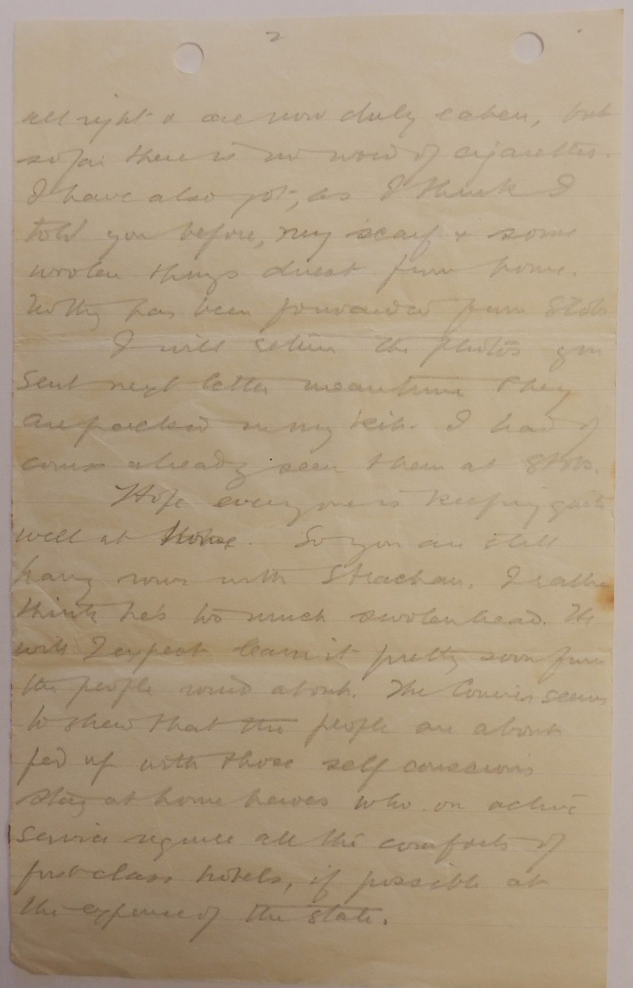 If you are sending any stuff out here to Tommies don’t send sweaters, cardigans, shirts, socks, etc. Any amount of these, as many as the people care to ask for are supplied free to the troops here. I know this for a fact. If they don’t get them it’s because their Quartermaster is rotten. But send out old magazines, matches & cigarettes out of bond. They get 50 cigs a week from the [Government] each but these are all of one class & Tommy gets fed up without his Woodbine or his Gold Flakes & mopes for variety. Send them of course cigarettes out of bond if possible. Also send ’em eatables but the people knitting are absolutely unnecessary. On active service if the officers are worth their salt and the Q.M. [Quartermaster] a good man Tommy wants for nothing in the way of necessaries either of food or dress. But he wants luxuries, his own luxuries, little things such as handkerchiefs and soap. He gets plenty towels, a sponge, any odds & ends – reels, even small knives & forks for Tommy loses these & is looked on with a wrathful eye when he seeks that which was lost from comrade or Quartermaster.