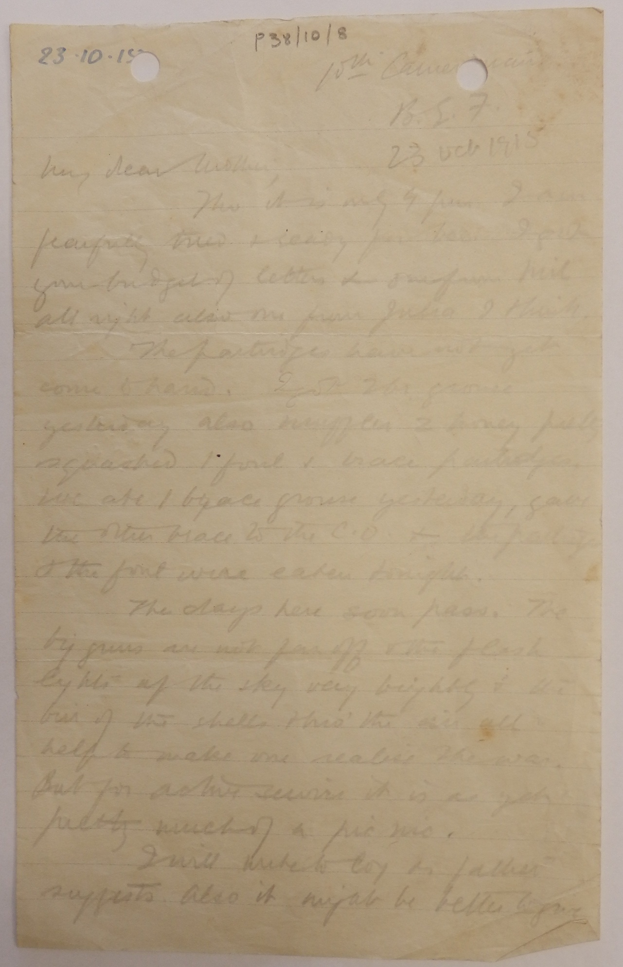 The partridges have not yet come to hand. I got the grouse yesterday also truffles & honey pretty squashed 1 fowl 1 brace partridges. We ate 1 brace grouse yesterday, gave the other brace to the C.O. & the partridge & the fowl were eaten tonight.