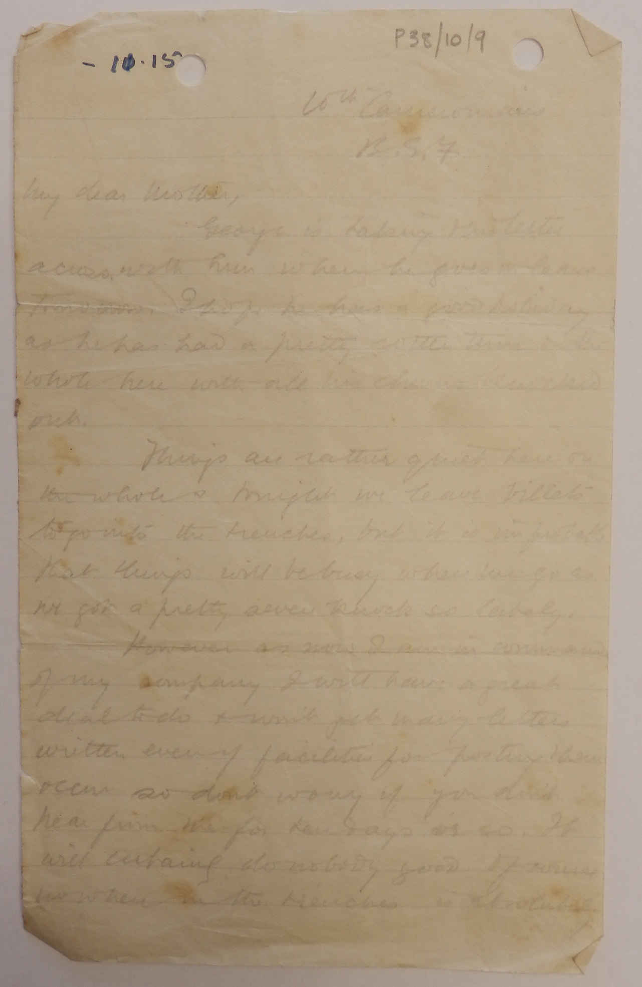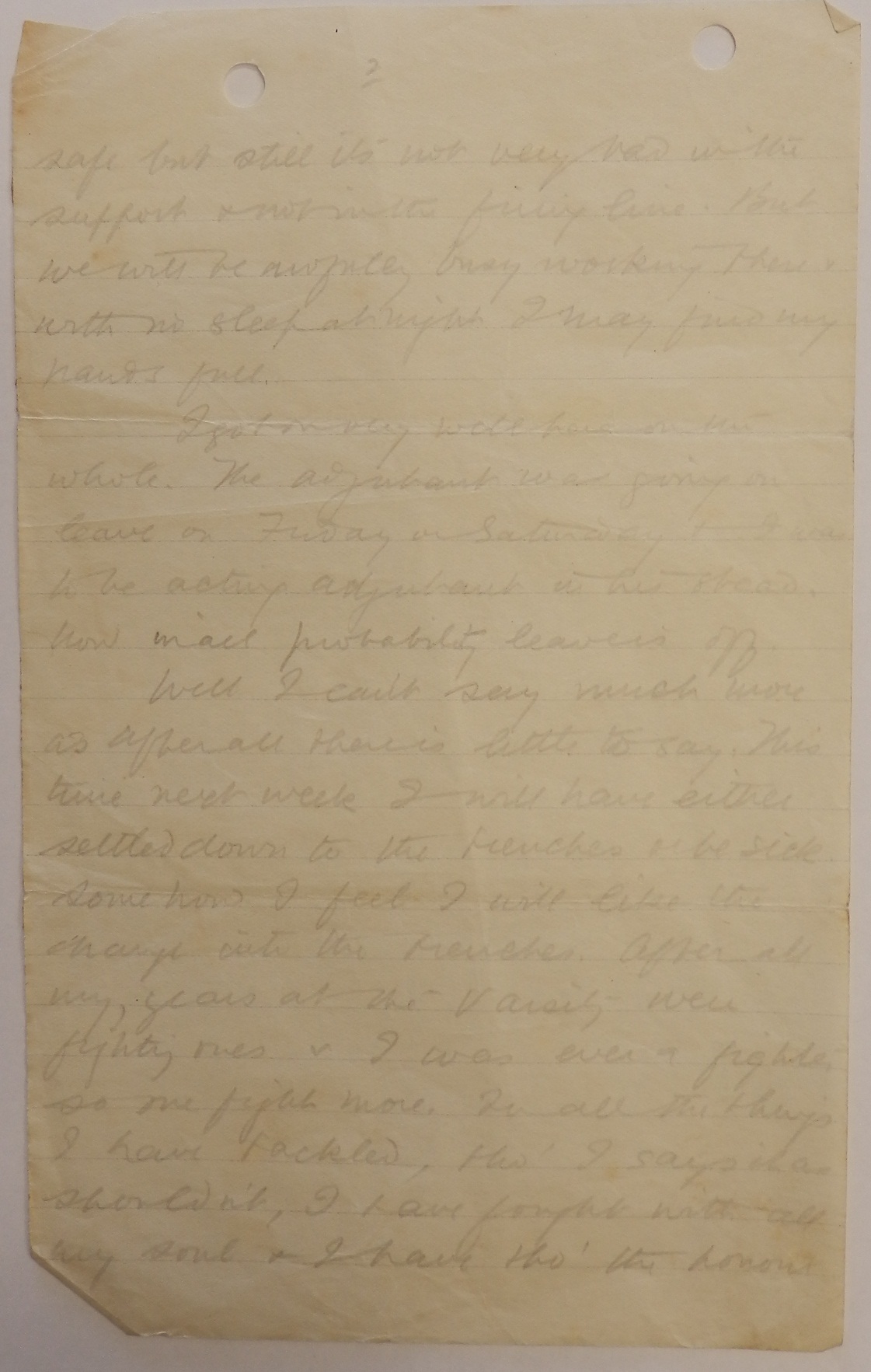 However as now I am in command of my company I will have a great deal to do & won’t get many letters written even if facilities for posting them occur, so don’t worry if you don’t hear from me for ten days or so. It will certainly do nobody good. Of course nowhere in the trenches is absolutely safe but still it’s not very bad in the support & not in the firing line. But we will be awfully busy working there & with no sleep at night I may find my hands full.