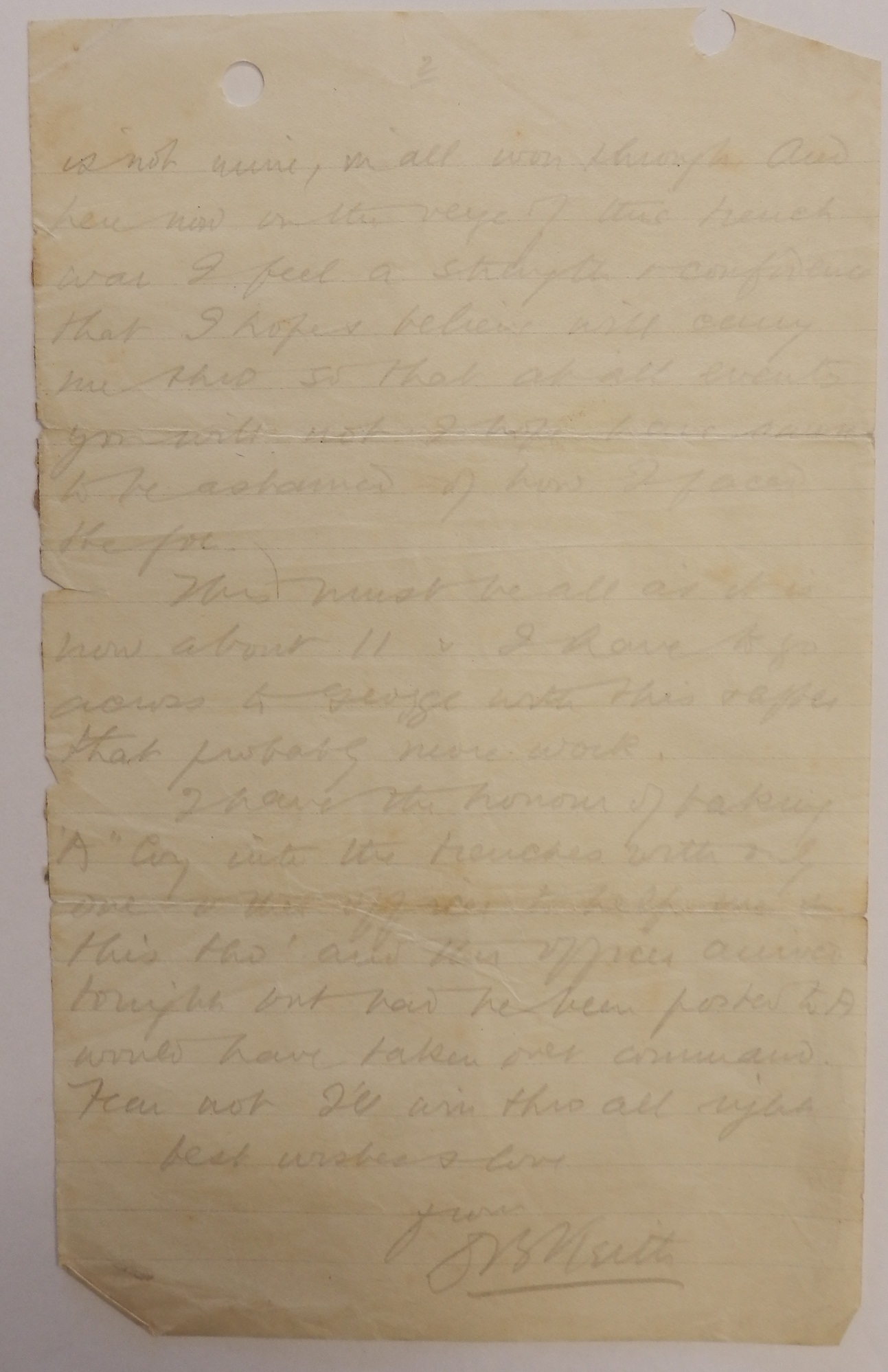 I have the honour of taking “A” Coy into the trenches with only one other officer to help me in this tho’, and this officer arrived tonight but had he been posted to A would have taken over command. Fear not I’ll win thro’ all right.