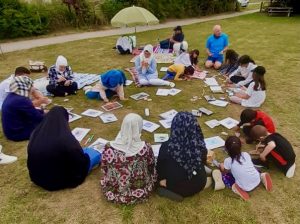 There to greet them are John Orr the local HLH Countryside Ranger and Anna Holda the Adult Learning Coordinator for Refugees at HLH along with tutors and helpers from the High Life Highland ESOL (English for Speakers of Other Languages) team. The children are running about and excited about the day ahead and the parents are smiling and dressed in bright colours. They are carrying picnic baskets and blankets which they layout on the grass.