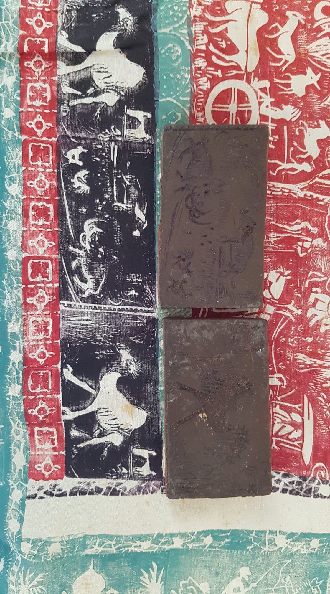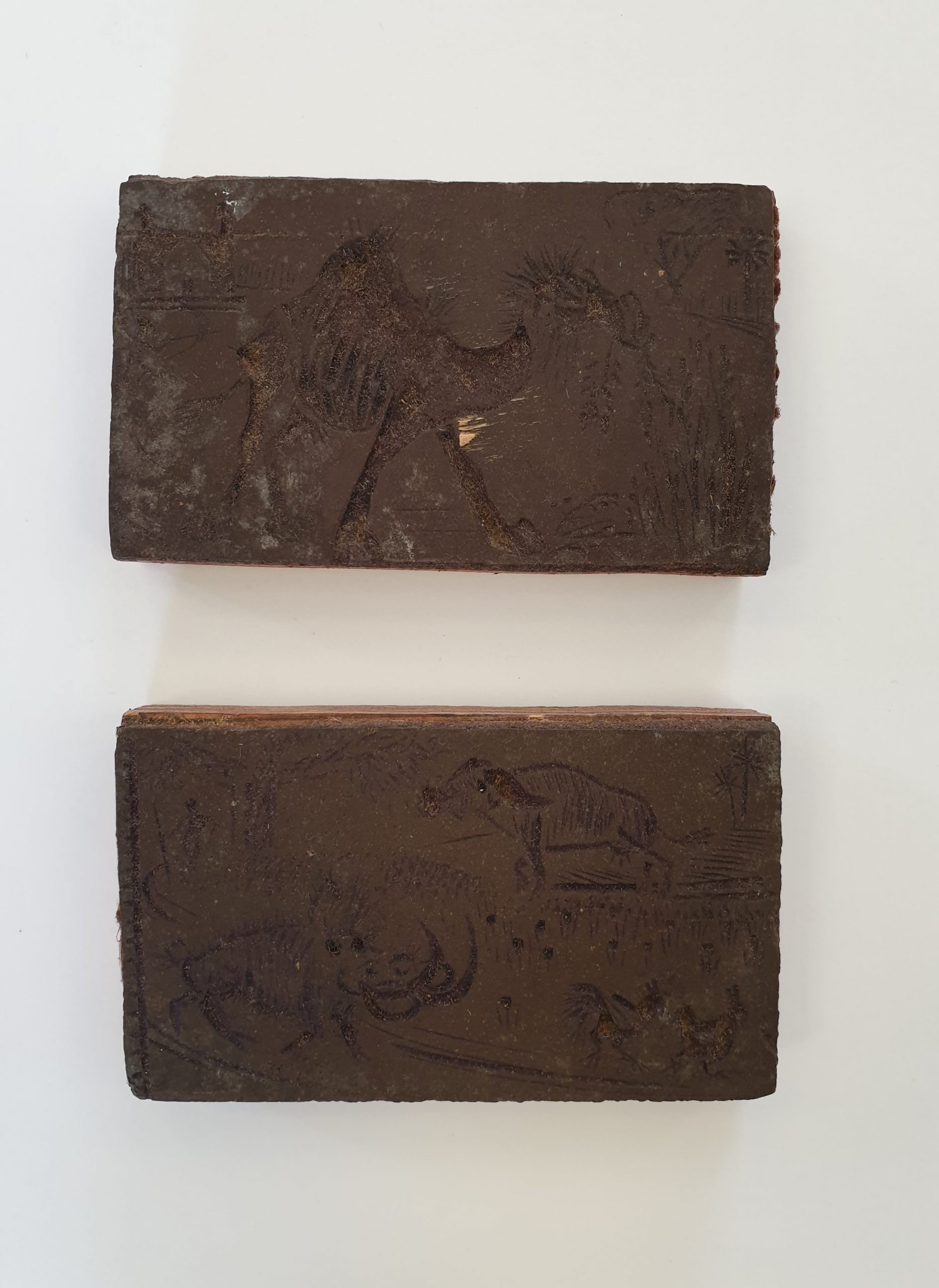 Lino blocks depicting a camel, chickens, a boar, and a buffalo, n.d. [SL/D188/7/3/9]