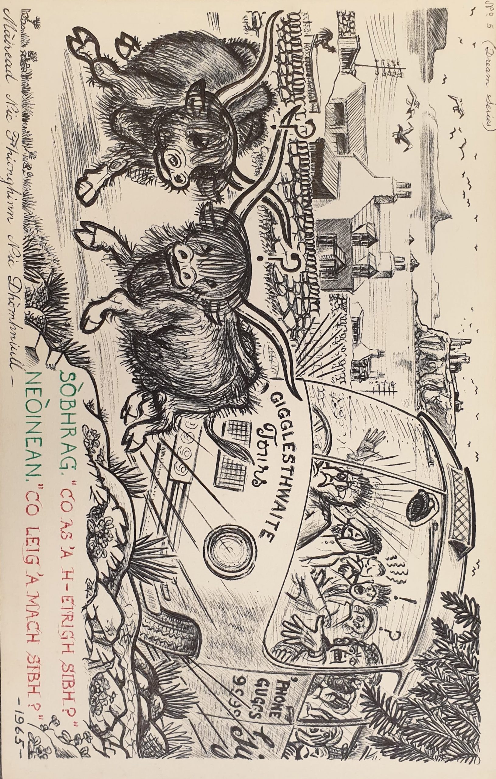 Their work was heavily influenced by their connections with the Highlands and Islands. For example, Mairead’s “Dream Series” commented on contemporary changes and events in the Highlands and Islands of Scotland. “Dream Series No. 5: Gigglesthwaite Tours” shows a bus tour which is being held up by two Highland cows, with Duntulm Castle, Skye, in the background. The cows, Sòbhrag (Primrose) and Neòinean (Daisy), ask the tourists: “Cò as a h-eirigh sibh?” (“Who did you arise from?”) and “Cò leig a mach sibh?” (“Who let you out?”)