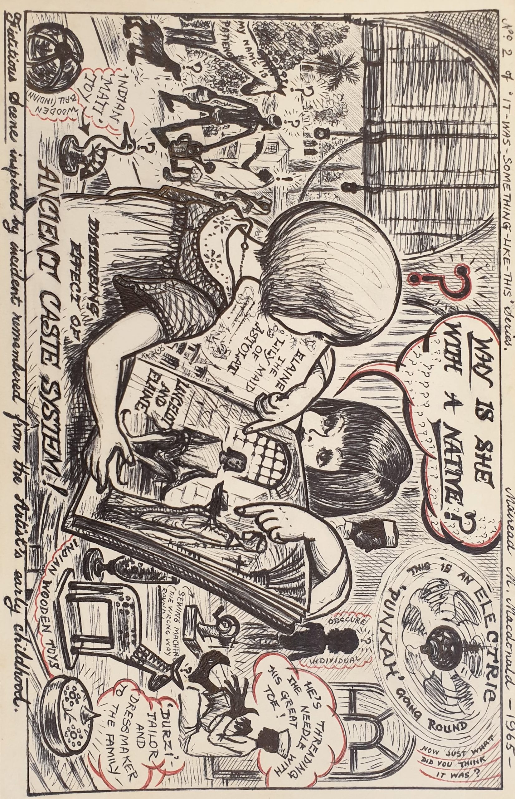 Cartoon set in India, captioned: “Disturbing effect of ancient caste system! Fictitious scene inspired by incident remembered from the artist’s early childhood”, Mairead Macdonald, 1965. [SL/D188/2/8/26]