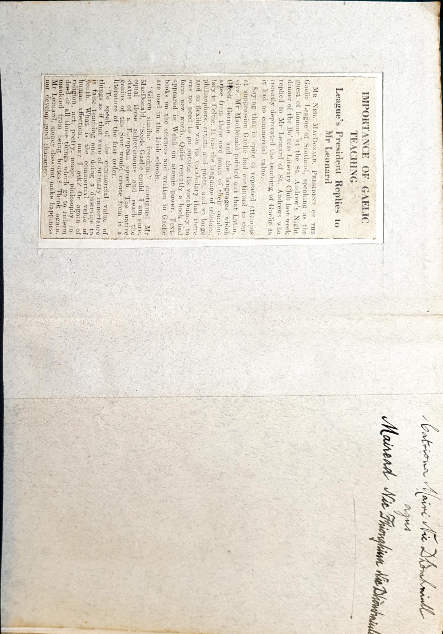 Dwelly’s Illustrated Gaelic-English dictionary, 4th edition. This dictionary will be familiar to many Gaelic speakers to this day. The inscription inside reads “Catriona Mairi NicDhòmhniull agus Mairead NicFhionghinn NicDhòmhniull” (Catriona Mairi Macdonald and Mairead Mackinnon Macdonald”), 1941.
