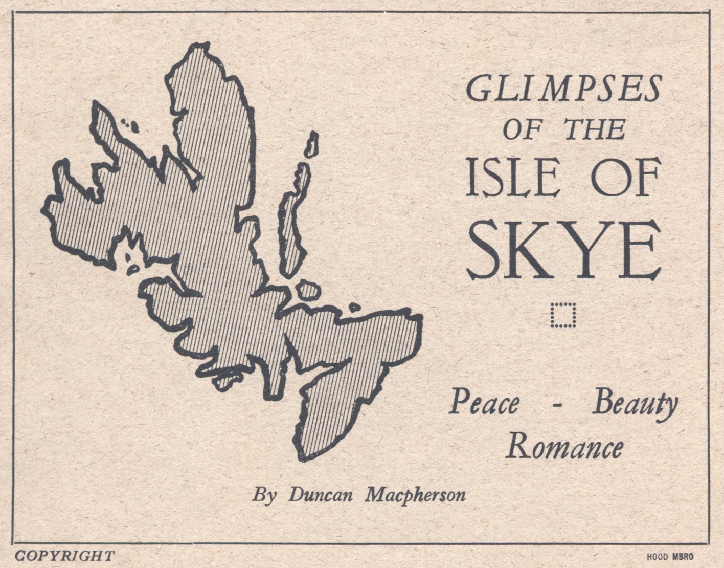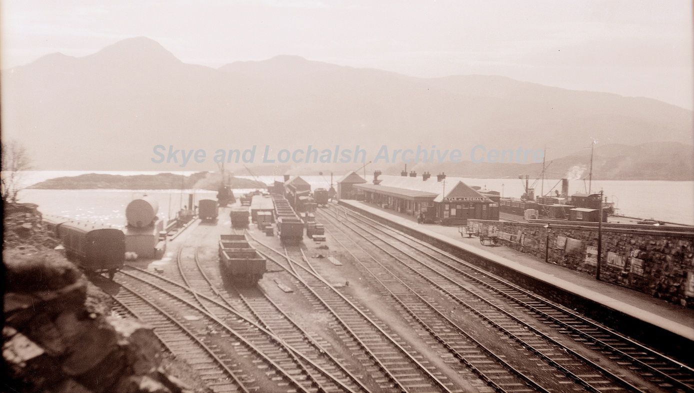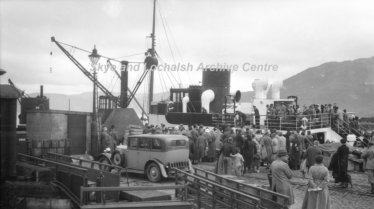 Chemist Duncan Macpherson established a pharmacy close to the ferry slipway at Kyle in 1911. As well as supplying medicines, toiletries, and photographic materials, the shop also became an unofficial tourist office. Macpherson began producing folded information cards detailing train and steamer times, events, excursions and postal information in the 1910s. The idea was later developed, and from 1927 until 1960 Macpherson published a Vest Pocket Guide to Skye and Lochalsh (priced at 2/- in 1956). This included steamer and train timetables, accommodation lists and information on sites of local interest. The extension of the railway to Kyle in 1897 had made it much easier to connect with the steamer services visiting the islands. Macpherson’s photographs from the 1920s and 30s often show the railway pier thronged with people.