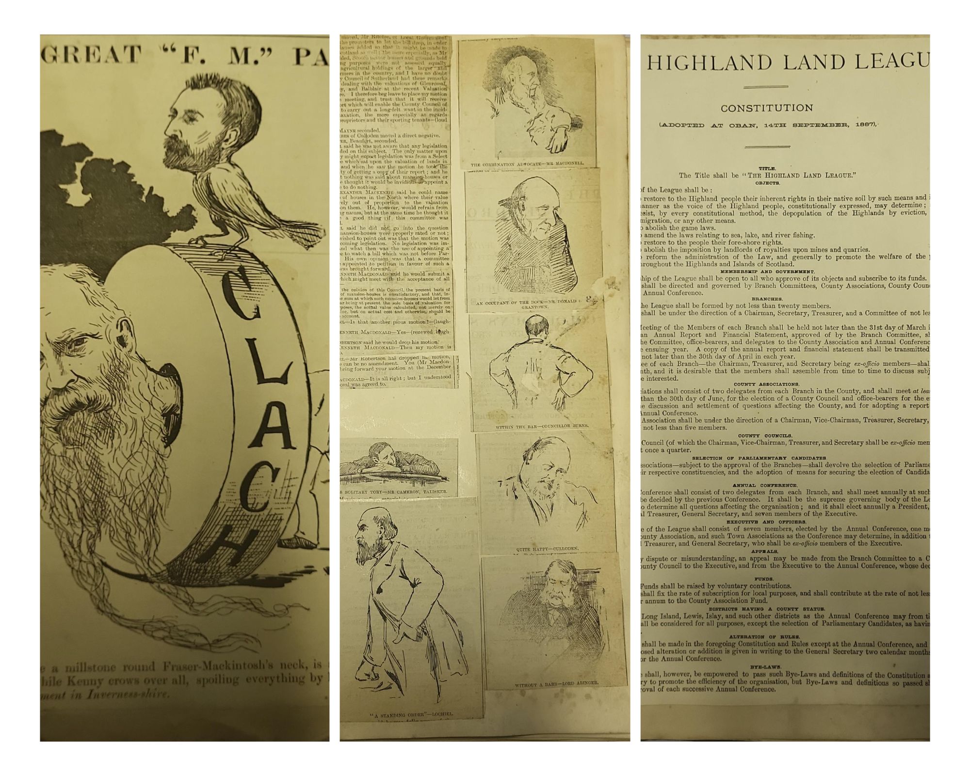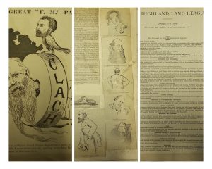 The second collection was from the family of Reverend James Reid, a Free Church minister based in Portree in the nineteenth century. He kept a scrapbook of mentions of land agitation in newspapers, spanning the Crofters’ War of the 1880s, including searing cartoons of the politicians of the day. This was bracketed by two heavy, silver candelabra, gifted to Anna Young Reid, the wife of Dugald MacLachlan, for their part in promoting the crofters’ cause. These added a tangibility to a story I had already been looking into for my own research: that of MacLachlan and his persecution at the hands of Sheriff William Ivory, the man responsible for the maintenance of law and order in Inverness-shire at the time. When Ivory’s attempts to have MacLachlan dismissed from his position as Sheriff-Clerk Depute in Portree were successful, crofters raised money to present MacLachlan with a gold watch and a purse of sovereigns.