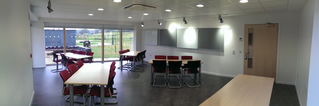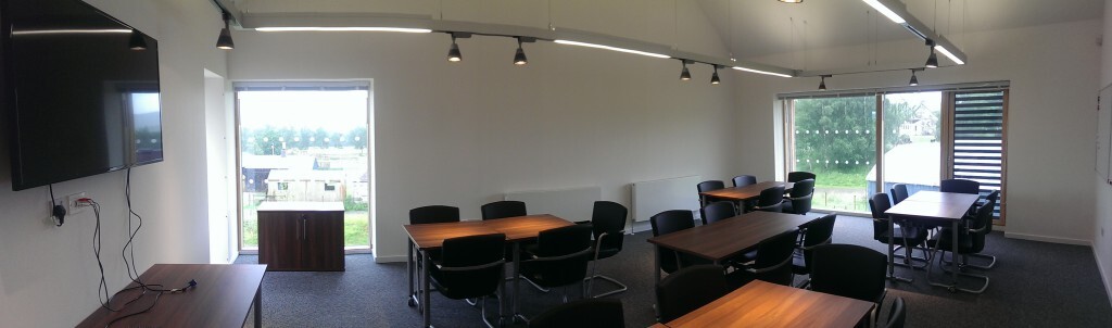 Am Fasgadh provides meeting rooms on both the ground and first floors, each with adjoining breakout spaces and toilet facilities. Rooms include wall‑mounted whiteboards and pin boards, and can be arranged in a variety of layouts. The Grant Room also features a 55‑inch wall‑mounted screen for presentations.