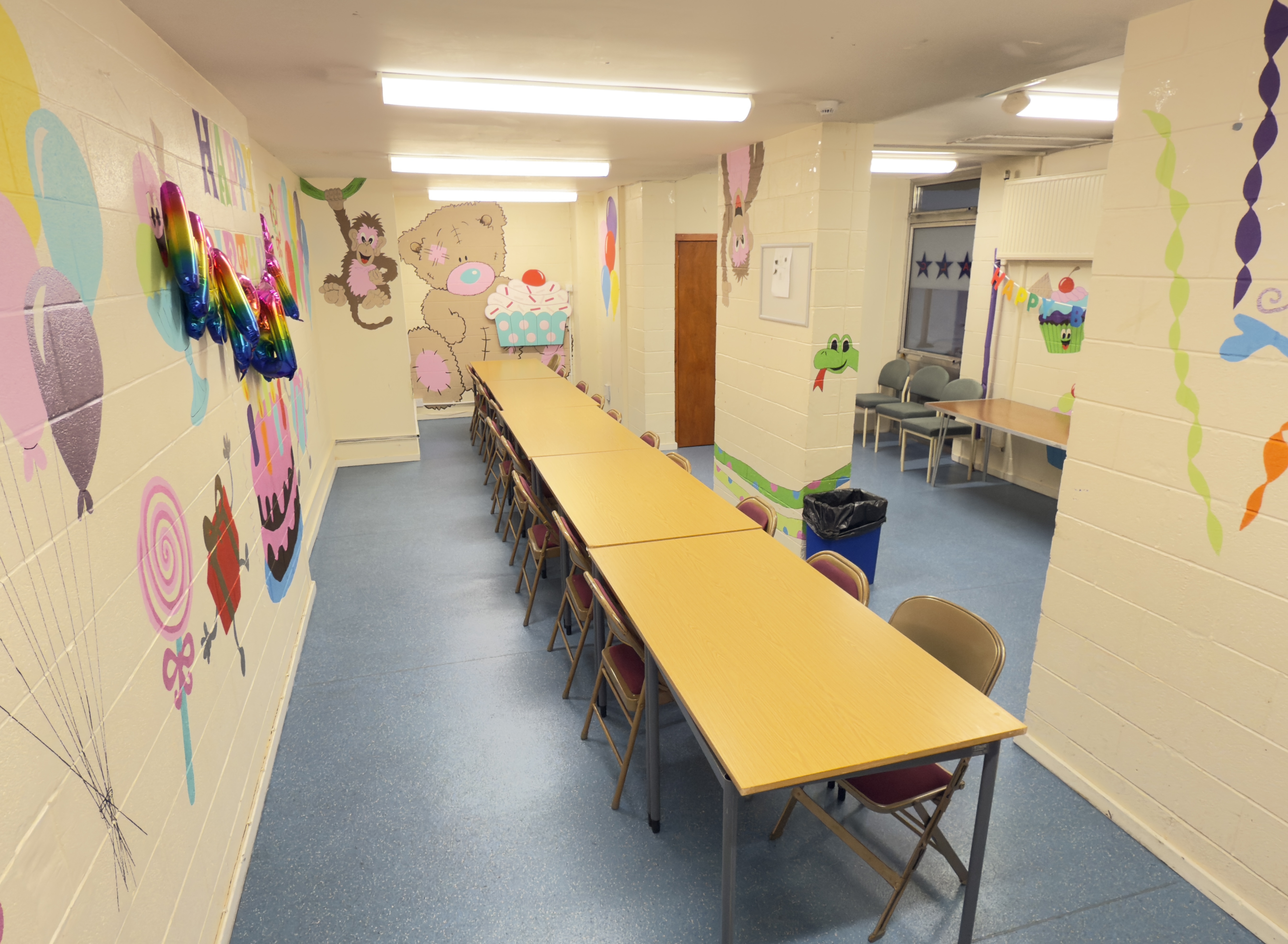 This bright, colourful room provides a cheerful and versatile setting ideal for meetings, training sessions, or lively parties. With seating for up to 18 people, it offers an intimate and welcoming atmosphere that works well for both formal and informal gatherings. The vibrant wall art and playful decorations add character and warmth, making the space especially appealing for creative workshops, children’s celebrations, or small community groups. Its practical layout, combined with its fun and inviting design, makes it a flexible venue that can easily adapt to a wide range of activities and events.