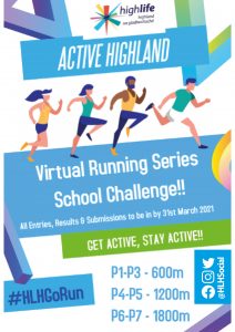 Whether as an individual, with your family or as part of a running club or school we are calling all primary aged children in the Highlands to take part in our Virtual Running Series. Each pupil who completed their local course and submits their entry will be gain an email certificate. We will also showcase the participation figures per primary school and running clubs weekly and award schools with the highest percentage of pupils taking part and the most amount of runs in the month as our ‘Active Highland Virtual Running Champions’.
