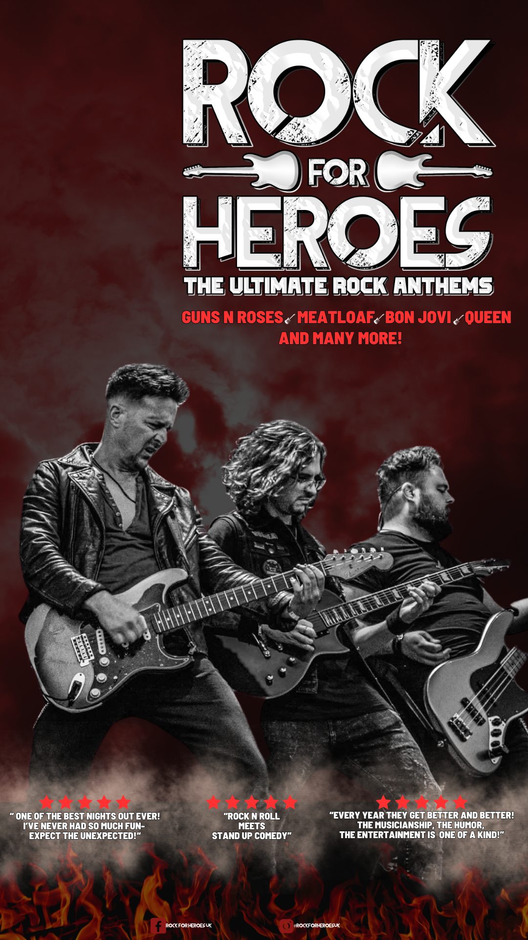 Classic rock anthems, incredible musicians, sensational vocalists and a ROCKTACULAR experience; with a lot of laughs thrown in! All the ingredients that make up the phenomenal, ‘Rock for Heroes’! Performed by a superb 7-piece band, the show breathes new life into the music of Guns ‘N’ Roses, Bon Jovi, Van Halen, Dire Straits, Fleetwood Mac, Queen and more! You’d be ‘Livin’ on a Prayer’ if you miss it! A show for all the family and a must see for any rock fan! Experience an evening that will awaken nostalgia, have you laughing till your sides hurt and ROCKIN’ the night away!