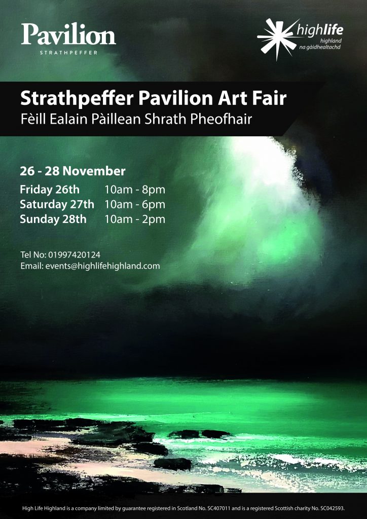 Shop Online or Visit Strathpeffer Pavilion Friday 26th - Sunday 28th November - Strathpeffer Pavilion Join 60 local and national artists at Strathpeffer Pavilion for the 2021 Art Fair and choose from a wide range of works on display. Please note that it is the buyers responsibility to arrange collection or onward delivery from Strathpeffer Pavilion. Opening Hours: Friday 10am-8pm | Saturday 10am-6pm | Sunday 10am-2pm