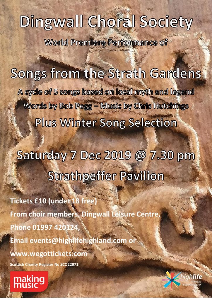 Dingwall Choral & District Choir returns to Strathpeffer Pavilion for their Songs of Strath Gardens and winter songs concert. A cycle of 5 songs based on local myth and legend. Words by Bob Pegg and music by Chris Hutchings Tickets also available at Dingwall Leisure Centre, 01997420124, [email protected]